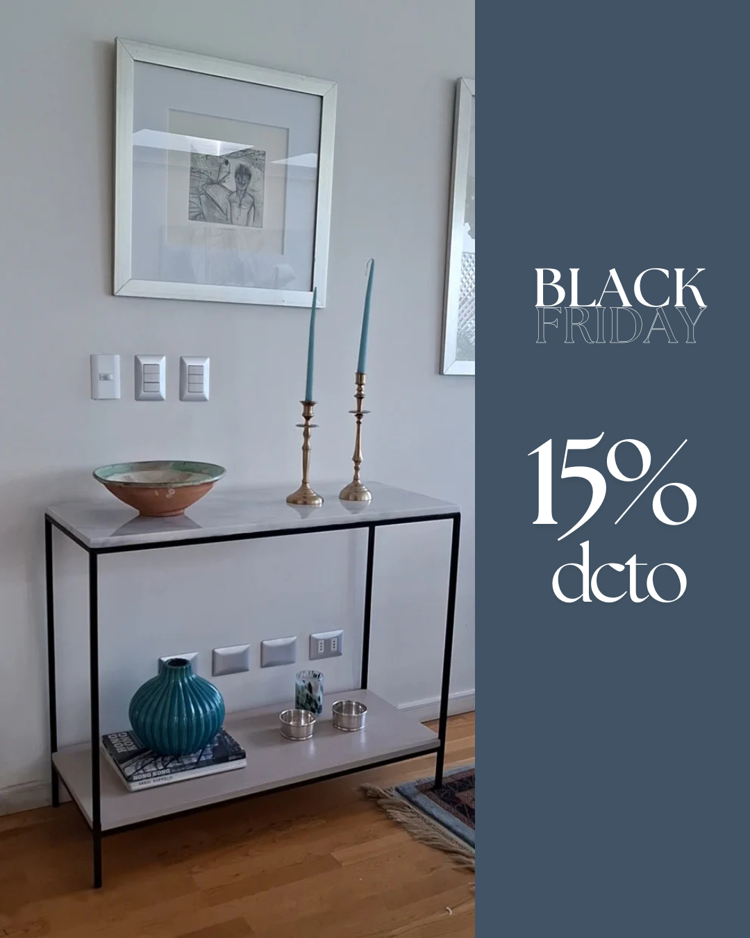 Estructura en perfil de 15x15mm pintado al horno negro mate. Cubierta en mármol carrara de 20m de espesor. Base en placa enchapada en encina con acabado blanqueado, terminación en poliuretano satinado.