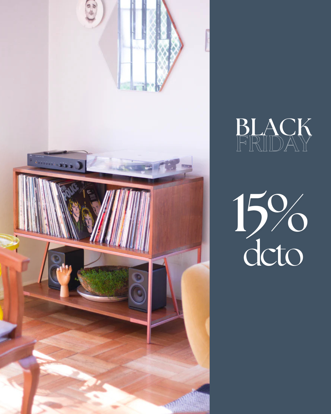 Caja y repisa inferior en placa enchapada en madera de Encina natural de 18mm de espesor con tinte Nogal Americano y acabado de PU satinado.