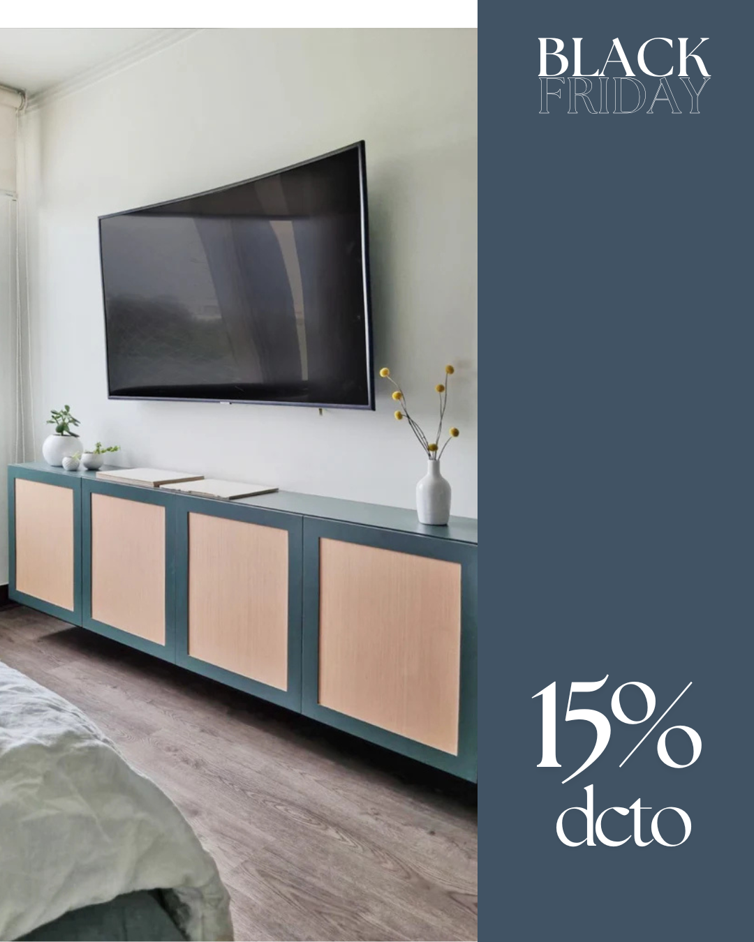 Puertas abatibles con bisagras de cierre suave. Frentes con chapa de madera natural y bordes en MDF con Lamitech Forest.