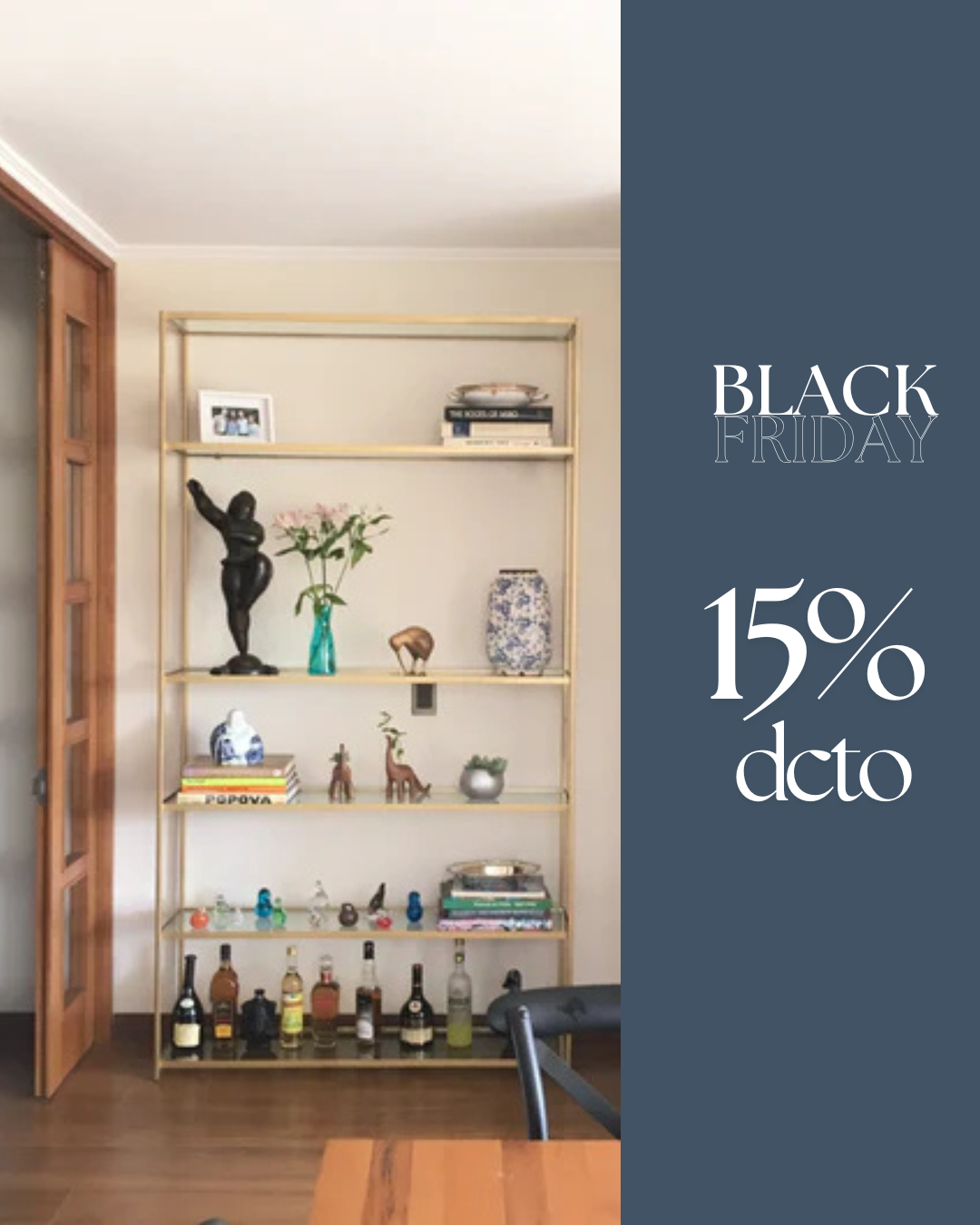 Estructura en fierro de 15 x 15 mm, terminación al horno dorado. Repisas en vidrio de 8mm de espesor.