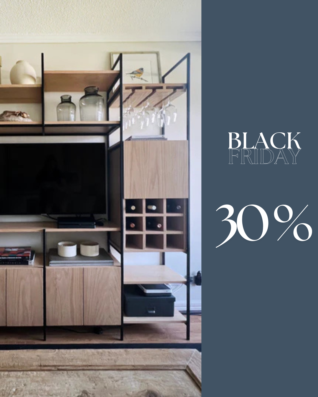 Repisas y puertas en placa enchapada en Encina natural con acabado de poliuretano satinado. 18mm de espesor.