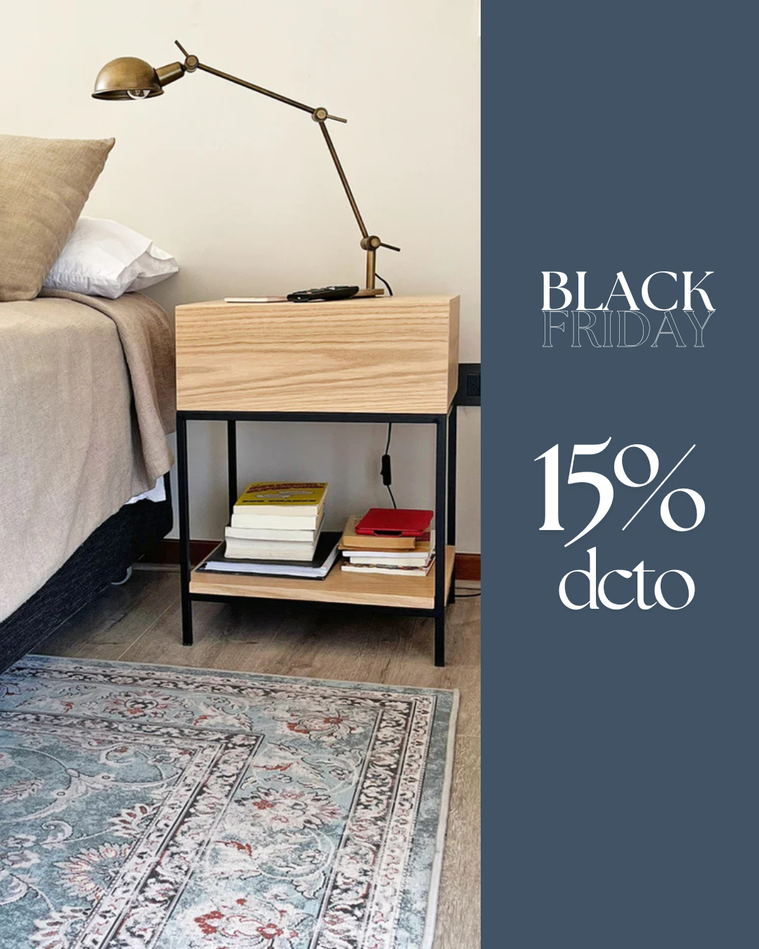 Cajón y repisa en placa enchapada en madera de Encina natural, acabado de PU satinado. Cajón con frente sin tirador con apertura superior en ángulo de 45° . Riel telescópico cierre suave.